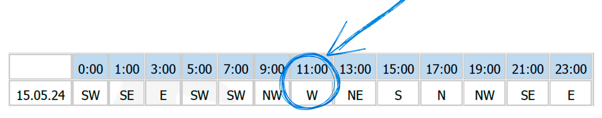 - In the chart, find the Zhi Fu direction corresponding to the current two-hour period. For example, on May 15 at 11:00-13:00, Zhi Fu is located in the west.