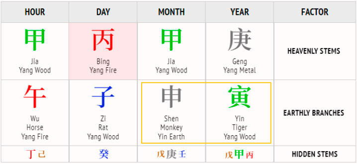 In the Bazi chart, one may have a clash caused by Tiger and Monkey,